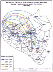 Fig. 2 and 3: Mayor migrant-fluxes in the "Región Inka" within 1976 1993 (Ramos; 1996).